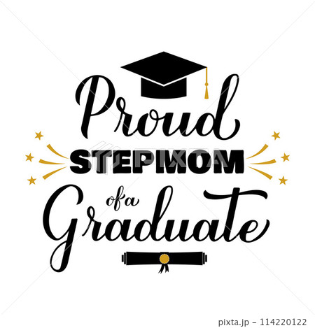 Proud stepmom of a graduate lettering with graduation cap. Graduation quote typography poster. Vector template for greeting card, banner, sticker, label, shirt, etc.