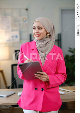 A woman in a pink jacket is writing on a tablet