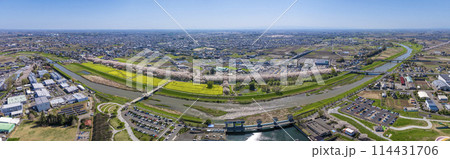 桜の名所_春の権現堂堤に咲く、満開の桜と菜の花畑_ドローン空撮パノラマ