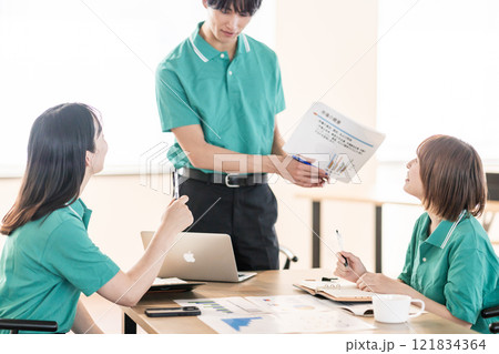 オフィスで打ち合わせをするユニフォーム姿の若いスタッフ