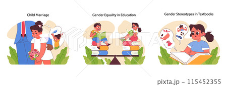 Social issues set. Young girls distress in forced wedding, children of diverse backgrounds enjoying education, and biases in study materials. Child rights, equal learning. Flat vector illustration