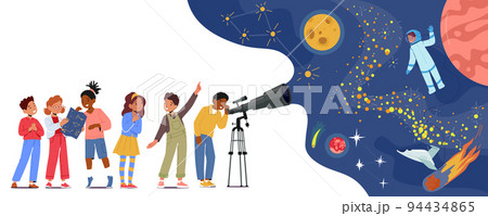 Children Look In Telescope, Curious Little Boys and Girls Study Astronomy Science. Kid Characters Observe Sky with Moon