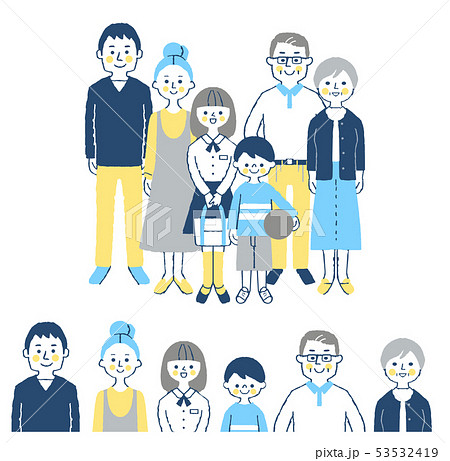 仲良しなファミリー 家族3世代イラスト_青系ストライプ