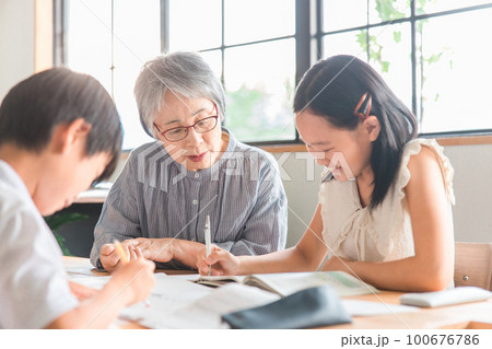 家のダイニングで孫の夏休みの宿題を教える高齢者女性と小学生の子供(帰省・里帰り)