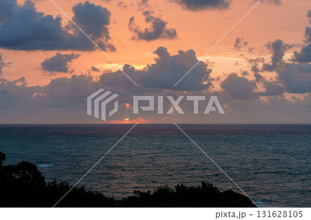 南紀勝浦熊野灘の夜明け 水平線上に顔を出した太陽と上空の美しい朝焼け空➃