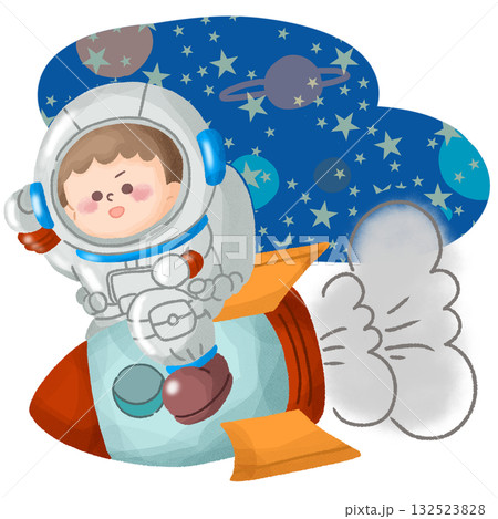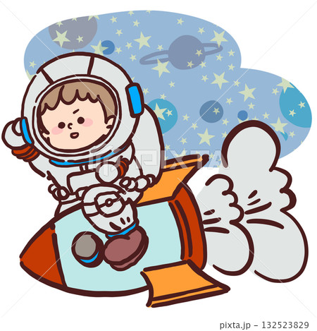 宇宙飛行士の格好をしてロケットに乗っている子どものイラスト