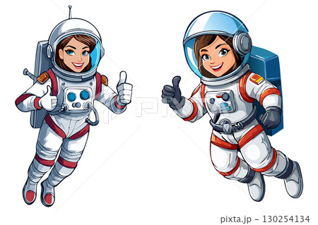 Cosmonaut floating in space, astronaut in spacesuit fling in the space, astronaut girl in space suit showing thumb up or like gesture, Smiling woman cosmonaut in helmet and uniform