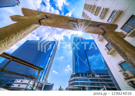 日本の東京都市景観 高輪ゲートウェイシティ前の稲荷神社などを望む
