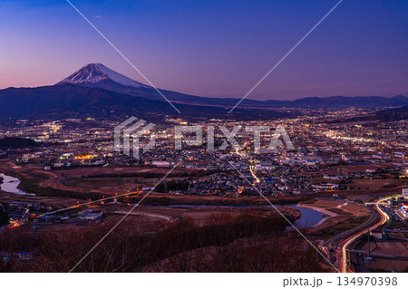 (静岡県)夕暮れ迫る静岡県東部の町並みと富士山