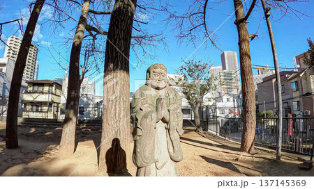 雑司ヶ谷・鬼子母神堂の石像と東京の街並み