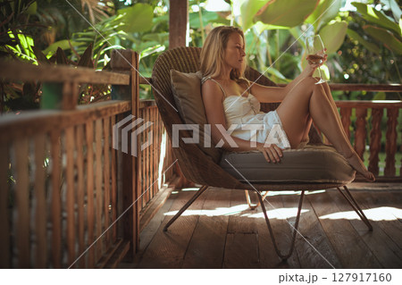 Young woman sit on open-air veranda of wooden bungalow with tropical garden view. Girl relaxing in luxury villa on family summer vacation. Tropical lifestyle.