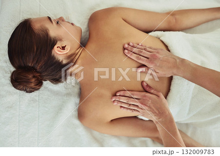 Relax, back and massage with woman in spa for wellness, luxury and cosmetics treatment from above. Skincare, peace and zen with female customer and hands of therapist for therapy, salon and detox