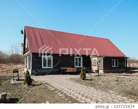 Charming Wooden House featuring a Vibrant Red Roof Set Against a Scenic Landscape Backdrop