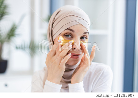 Young Muslim woman wearing headscarf applying gold hydrogel patches under her eyes, emphasizing skincare and self-care practices, photographed in modern environment promoting beauty, health