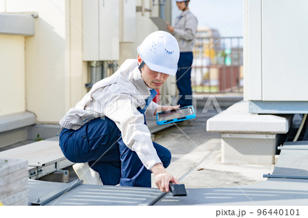 タブレットでビル天井の破損箇所を撮影する作業服姿の男性