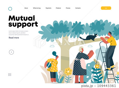 Mutual Support: Rescue cat from tree -modern flat vector concept illustration of elderly woman and man on a ladder under the tree Metaphor of voluntary, collaborative exchanges of resource, services