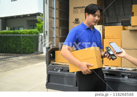 Woman making contactless payment with phone and receiving parcel box from delivery man