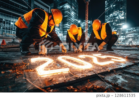 Workers in Hard Hats and Vests at Construction Site and a large sign displaying 2025