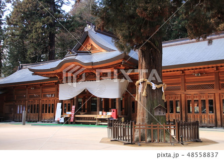 信州 安曇野 穂高神社 拝殿と大杉 安曇野観光の中心的存在 古代海洋民族の安曇族が創始した神社
