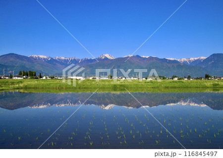 安曇野からの水田と北アルプス・西方面(長野県・安曇野市)