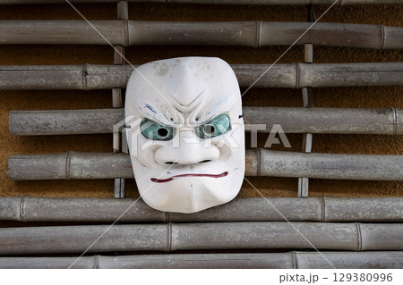 レトロな温泉施設 古民家の軒先に飾られている能面