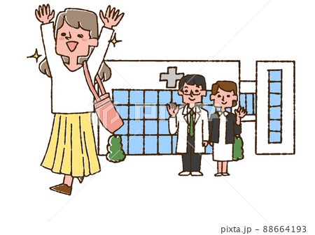 退院した女性と見送る医師と看護師 コミカルな手書きの人物 ベクター、線画にカラー