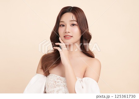 Beautiful young asian woman with clean fresh skin on beige background, Face care, Facial treatment, Cosmetology, beauty and spa, Asian women portrait.