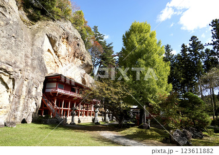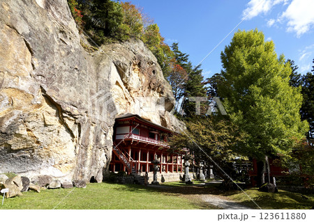 崖下の岩屋に建つ達谷窟毘沙門堂の屋根と崖上の紅葉 青空