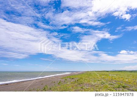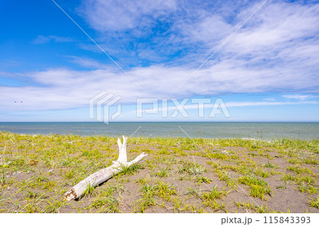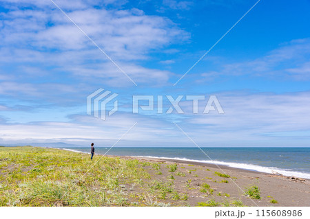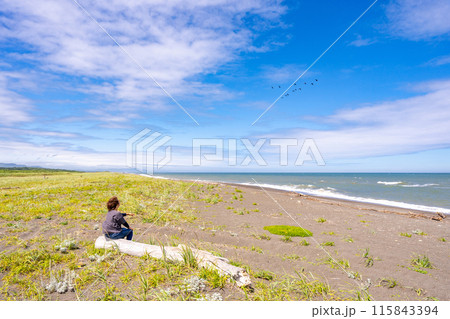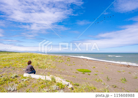 夏のオホーツク海と草原 流木に座り渡り鳥を見つめる女性