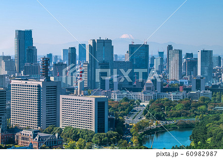 日本の東京都市景観 霞が関の官庁街などを望む(奥に富士山)