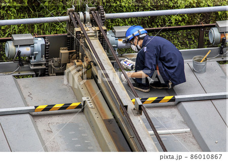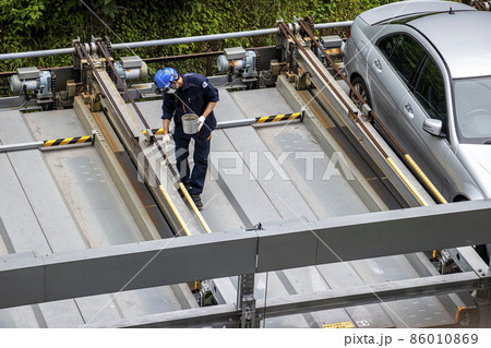 機械式駐車場のパレット上で定期点検・メンテナンス作業を行う男性作業員