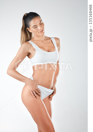 Woman in underwear, legs and body with hair removal, skincare and wellness isolated on white background. Female model, natural cosmetics and epilation for grooming with hygiene and cosmetic care