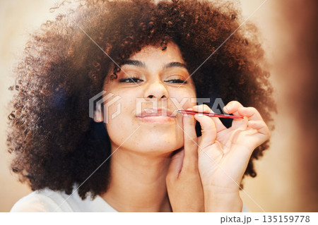 Young woman applying lipstick at vanity mirror