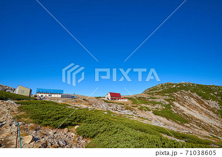 長野県の秋の駒ヶ岳(宝剣岳)の乗越浄土付近から山小屋を眺める