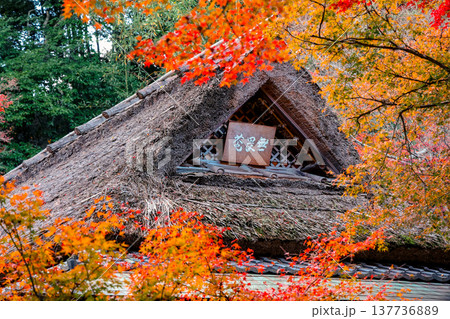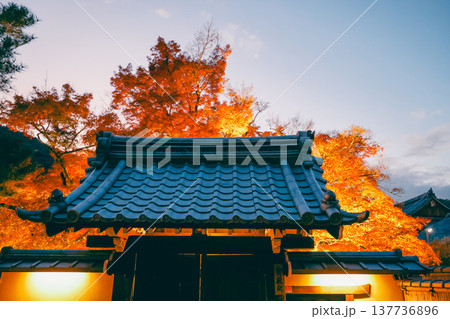 Autumn maple leaf illumination over roof of Hogonin, Arashiyama