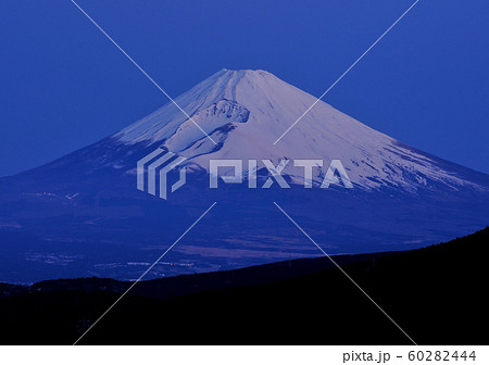 箱根から芦ノ湖越しに冠雪した富士山 夜明け