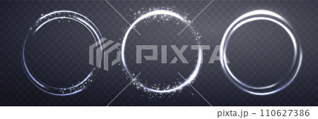 Silver magic rings set, with glowing particles. Neon realistic energy flare halo ring. Abstract light effect on a dark transparent background. Vector illustration.