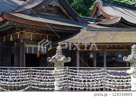 香川県金刀比羅宮三穂津秘め社拝殿と南渡殿前のおみくじ結び