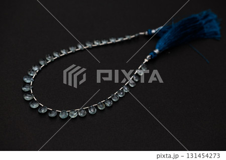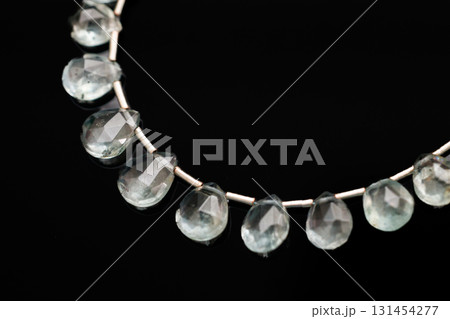 黒背景に映えるモスアクアマリンのファセットブリオレットビーズ