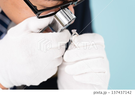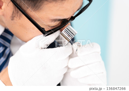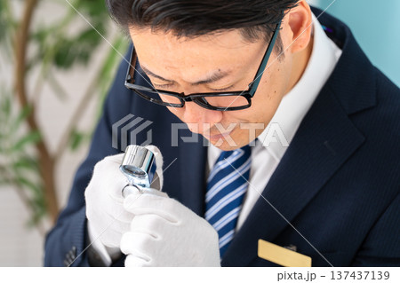 ルーペで指輪を見るミドルの男性 宝石鑑定士 イメージ