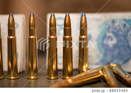 Live ammunition with bullets, bills, close-up, selective focusing. Concept: sale of weapons under lend-lease, assistance with weapons, mercenaries in the army, trade in ammunition.
