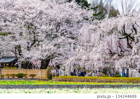 「山梨県」実相寺の桜と約8万本のラッパ水仙