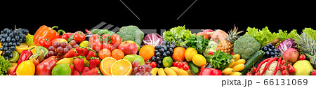 Panoramic photo fruits and vegetables on black