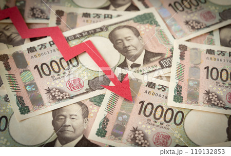 一万円札と右肩下がりの矢印 下降 紙幣 下向き