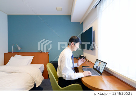 出張先のホテルでビデオ会議をするビジネスマン
