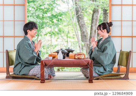 旅館で会席料理・食事を楽しむ夫婦・カップル(グルメ・部屋食・懐石料理・御膳・贅沢)