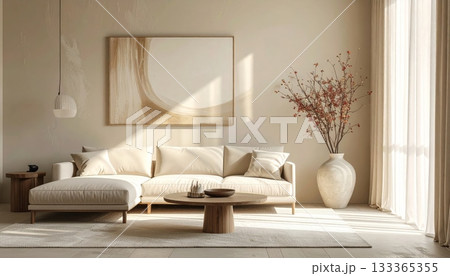 Contemporary living room interior design with comfortable sofa, floor lamp, and modern furniture