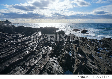 太平洋の水平線を背景に室戸ユネスコ世界ジオパーク行当黒見海岸サイトの風景 Ver1