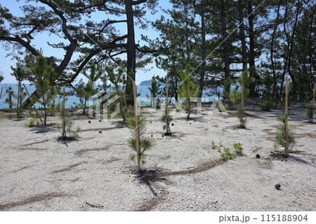 白砂と白波が続く室積海岸。西方向を望む(山口県光市)