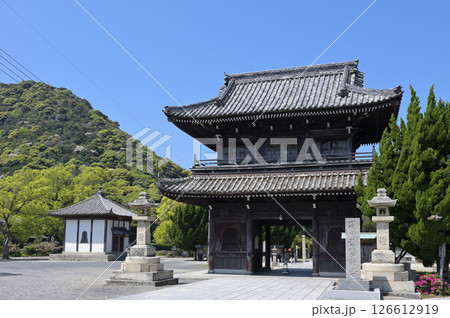 普賢寺の山門。新緑の峨嵋山を背景に(山口県光市)